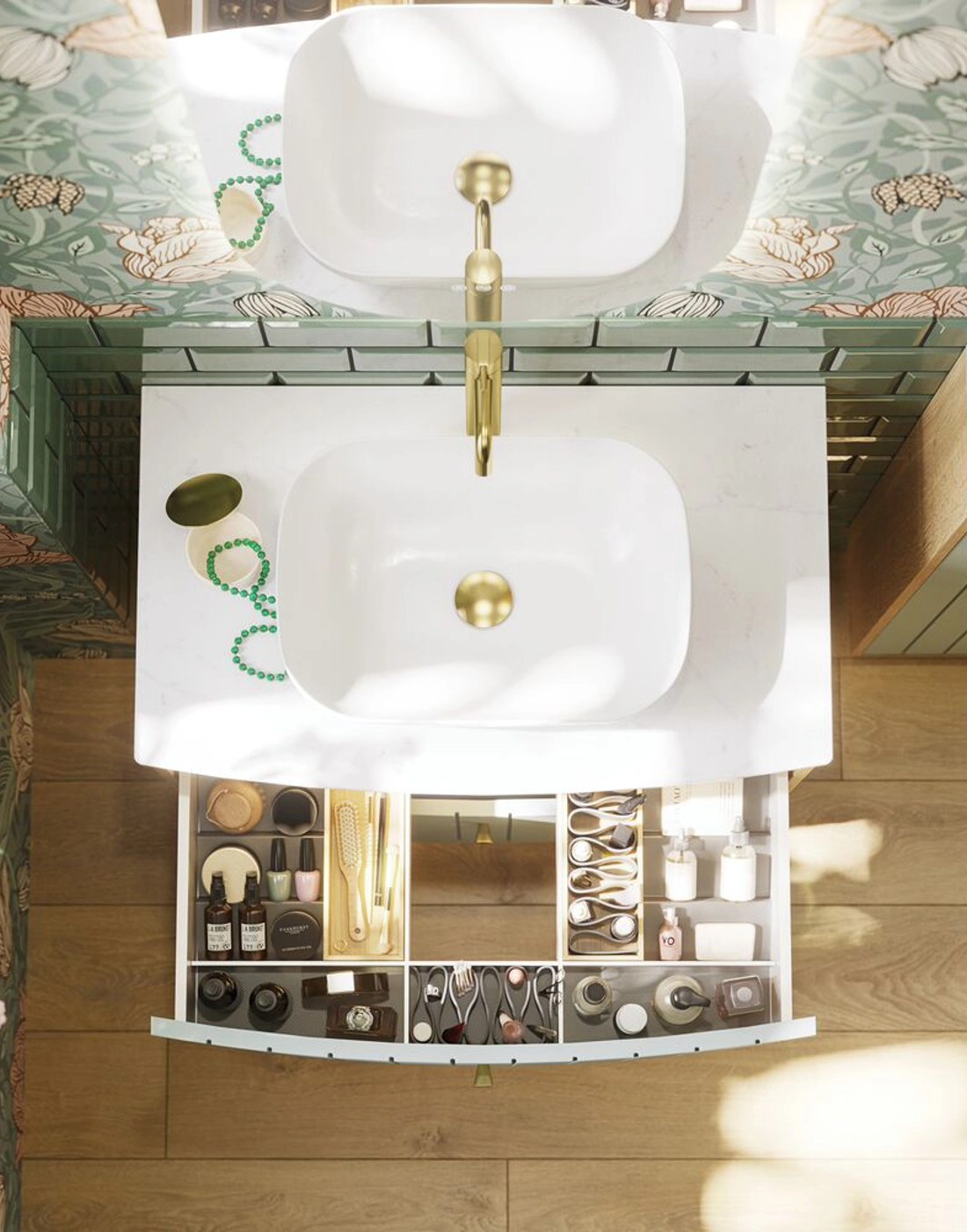 Deze meubelen met twee laden bieden een charmant retro design voor je badkamer. De gebogen fronten hebben verticale groeven voor een karaktervol design. De kasten zijn verkrijgbaar in verschillende kleuren, zodat je de kleur kunt kiezen die het beste bij jouw persoonlijke stijl past. Naast hun mooie uiterlijk zijn de kasten ook praktisch met twee ruime lades voor het opbergen van je benodigdheden. Voeg tijdloze elegantie toe aan je badkamer met deze badmeubels en geniet van de unieke touch die ze aan de ruimte geven. Let op: er geldt een opstarttarief (BI1) voor producten met wenskleur. Deze wordt eenmalig betaald per wenskleur, ongeacht het aantal producten. Vergeet niet de kleine praktische dingen aan je badkamermeubels toe te voegen waar je dagelijks plezier van hebt. Bijvoorbeeld verlichting in lades en kastjes, ingebouwde stopcontacten en gedimde sensorlampjes onder de meubels om nachtelijke bezoeken aan de badkamer te begeleiden. Opties worden tegelijk met je meubels bested.