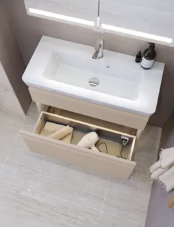 Het wastafelonderkast met lades is de ideale oplossing voor jouw badkamer. Met een diepte van slechts 35 cm is het perfect voor kleinere ruimtes. De hoge onderste lade biedt extra opbergruimte voor grotere badkamerartikelen, zodat je alles gemakkelijk op orde kunt houden. Met de geïntegreerde greep krijg je zowel functionaliteit als een strakke uitstraling, waardoor je je spullen elegant en praktisch kunt organiseren. Let op: er geldt een opstarttarief (BI1) voor producten met wenskleur. Deze wordt eenmalig betaald per wenskleur, ongeacht het aantal producten. Vergeet niet de kleine praktische dingen aan je badkamermeubels toe te voegen waar je dagelijks plezier van hebt. Bijvoorbeeld verlichting in lades en kastjes, ingebouwde stopcontacten en gedimde sensorlampjes onder de meubels om nachtelijke bezoeken aan de badkamer te begeleiden. Opties worden tegelijk met je meubels bested.