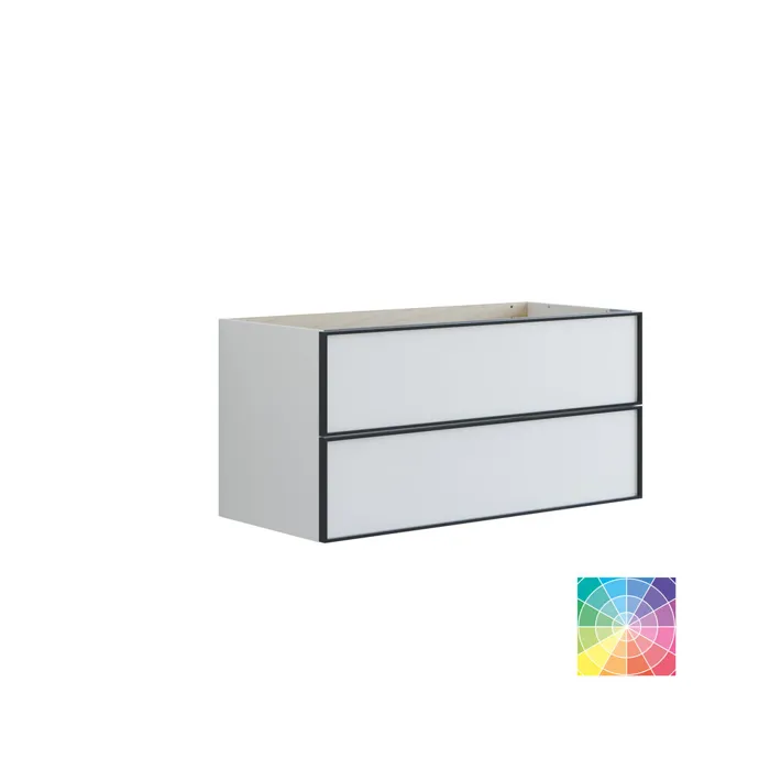 Upgrade uw badkamer met het wastafelonderkast met 2 lades. Dit stijlvolle kast is 48 cm hoog en 44 cm diep, ideaal voor het organiseren van uw badkamerartikelen. Het elegante zwarte frame rondom de lades voegt een moderne en strakke uitstraling toe die bij elke inrichting past. Kies uit verschillende kleuren om de kleur te vinden die het beste bij uw stijl past. Het kast biedt slimme opbergruimte, zodat u alles eenvoudig op orde kunt houden. Het wastafelonderkast met 2 lades combineert functionaliteit met esthetiek en is een mooie aanvulling op uw badkamer. Maak uw ruimte georganiseerder en uitnodigender met dit fantastische wastafelonderkast. Let op: er geldt een opstarttarief (BI1) voor producten met wenskleur. Deze wordt eenmalig betaald per wenskleur, ongeacht het aantal producten. Vergeet niet de kleine praktische dingen aan je badkamermeubels toe te voegen waar je dagelijks plezier van hebt. Bijvoorbeeld verlichting in lades en kastjes, ingebouwde stopcontacten en gedimde sensorlampjes onder de meubels om nachtelijke bezoeken aan de badkamer te begeleiden. Opties worden tegelijk met je meubels bested.