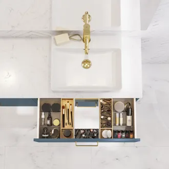 Transformeer je badkamer tot een uitnodigende oase met het wastafelonderkast met gladde front. Met twee ruime lades van elk 32 cm hoog heb je voldoende ruimte om je badkamerbenodigdheden te organiseren. Het strakke en minimalistische ontwerp geeft een moderne uitstraling die perfect past in elke badkamer. De gladde oppervlakken zijn gemakkelijk schoon te maken en te onderhouden, zodat je kunt genieten van een stijlvolle en functionele ruimte. Let op: er geldt een opstarttarief (BI1) voor producten met wenskleur. Deze wordt eenmalig betaald per wenskleur, ongeacht het aantal producten. Vergeet niet de kleine praktische dingen aan je badkamermeubels toe te voegen waar je dagelijks plezier van hebt. Bijvoorbeeld verlichting in lades en kastjes, ingebouwde stopcontacten en gedimde sensorlampjes onder de meubels om nachtelijke bezoeken aan de badkamer te begeleiden. Opties worden tegelijk met je meubels bested.
