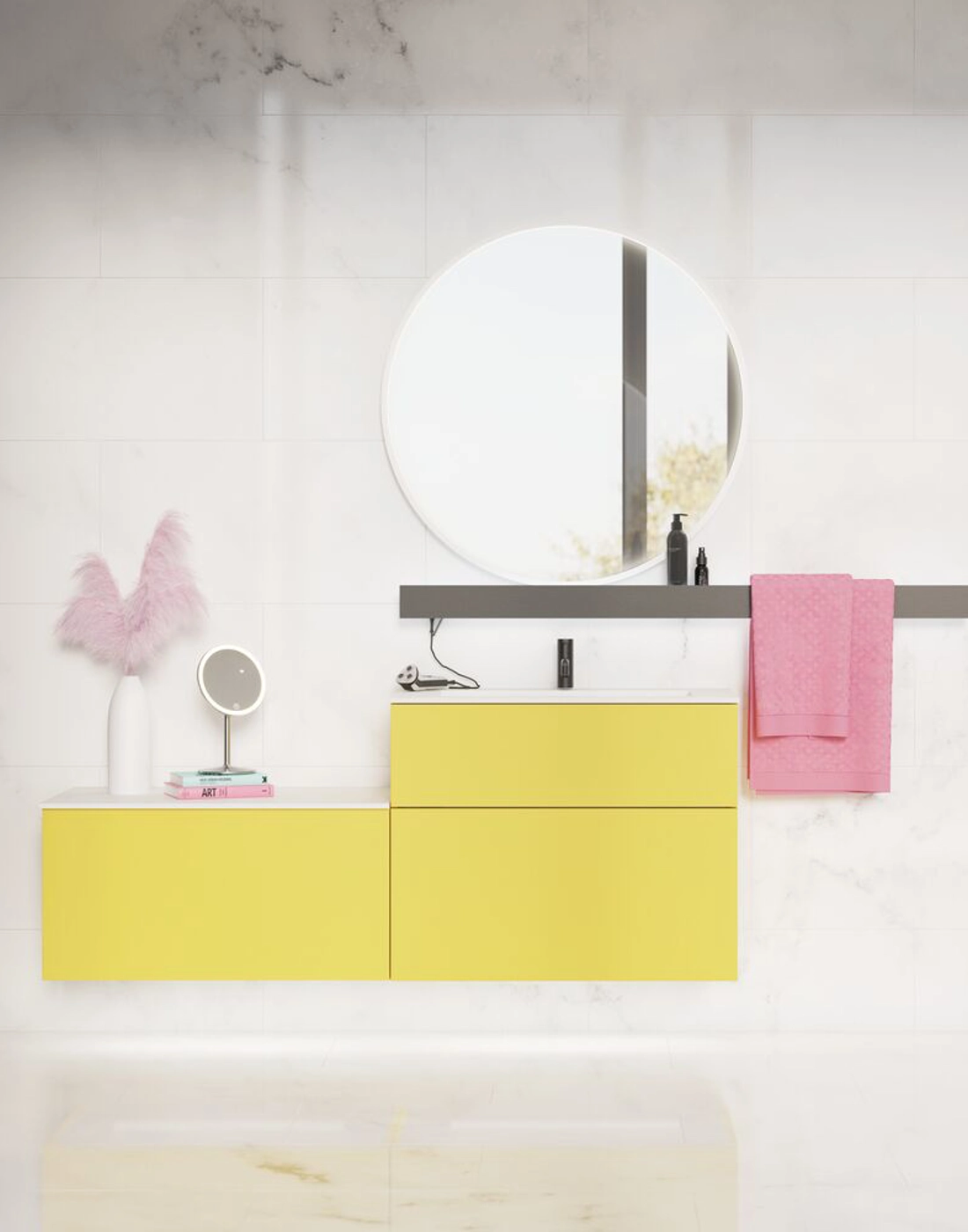 Het badmeubel met twee laden is 64 cm hoog en heeft een extra hoge onderste lade voor meer opbergruimte. Kies uit verschillende kleuren die passen bij jouw persoonlijke stijl. Met dit badmeubel kun je eenvoudig je badkamerspullen organiseren en overzicht houden. Met het badmeubel met 2 lades voeg je zowel functionaliteit als design toe aan je badkamer. Maak je ruimte georganiseerder en eleganter met dit hoogwaardige badmeubel. Let op: er geldt een opstarttarief (BI1) voor producten met wenskleur. Deze wordt eenmalig betaald per wenskleur, ongeacht het aantal producten. Vergeet niet de kleine praktische dingen aan je badkamermeubels toe te voegen waar je dagelijks plezier van hebt. Bijvoorbeeld verlichting in lades en kastjes, ingebouwde stopcontacten en gedimde sensorlampjes onder de meubels om nachtelijke bezoeken aan de badkamer te begeleiden. Opties worden tegelijk met je meubels bested.