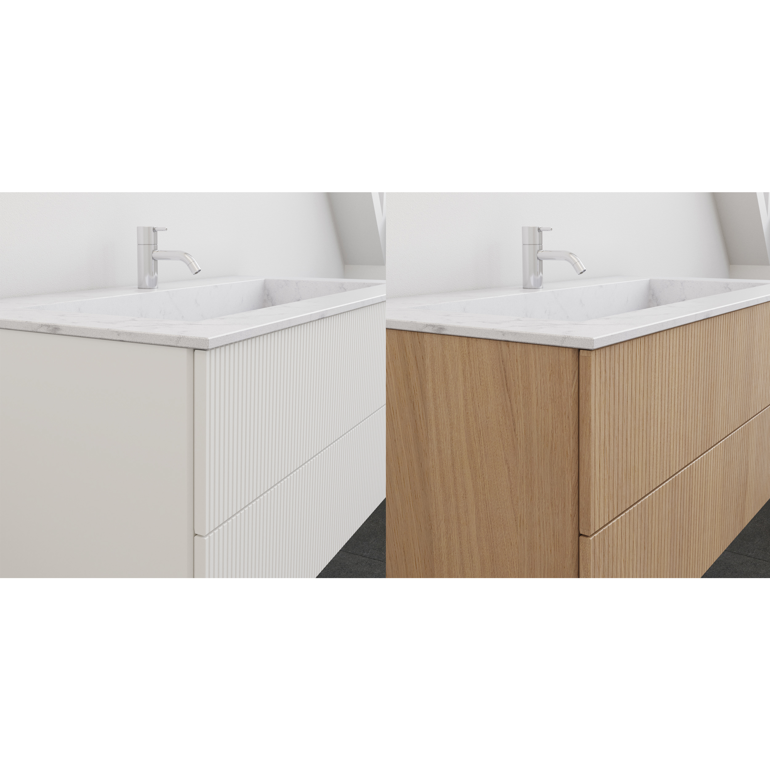 Geef je badkamermeubel een moderne en exclusieve uitstraling met een smal gegroefd front van Calidris. De fijne verticale lijnen creëren een levendig spel in het oppervlak en voegen een unieke structuur toe die de badkamer karakter en elegantie geeft. Het front is verkrijgbaar in verschillende kleuren en een prachtige houtfineer, zodat je precies de sfeer kunt kiezen die bij jouw stijl past - van warm en natuurlijk tot koel en verfijnd. Het gegroefde oppervlak is een sterk designdetail dat je badkamermeubel tot iets bijzonders verheft. Noot: Dit front werkt als een optie voor je meubel, dus selecteer eerst de maat en het artikelnummer van je badkamermeubel en voeg dan het optionele front toe aan je bestelling.