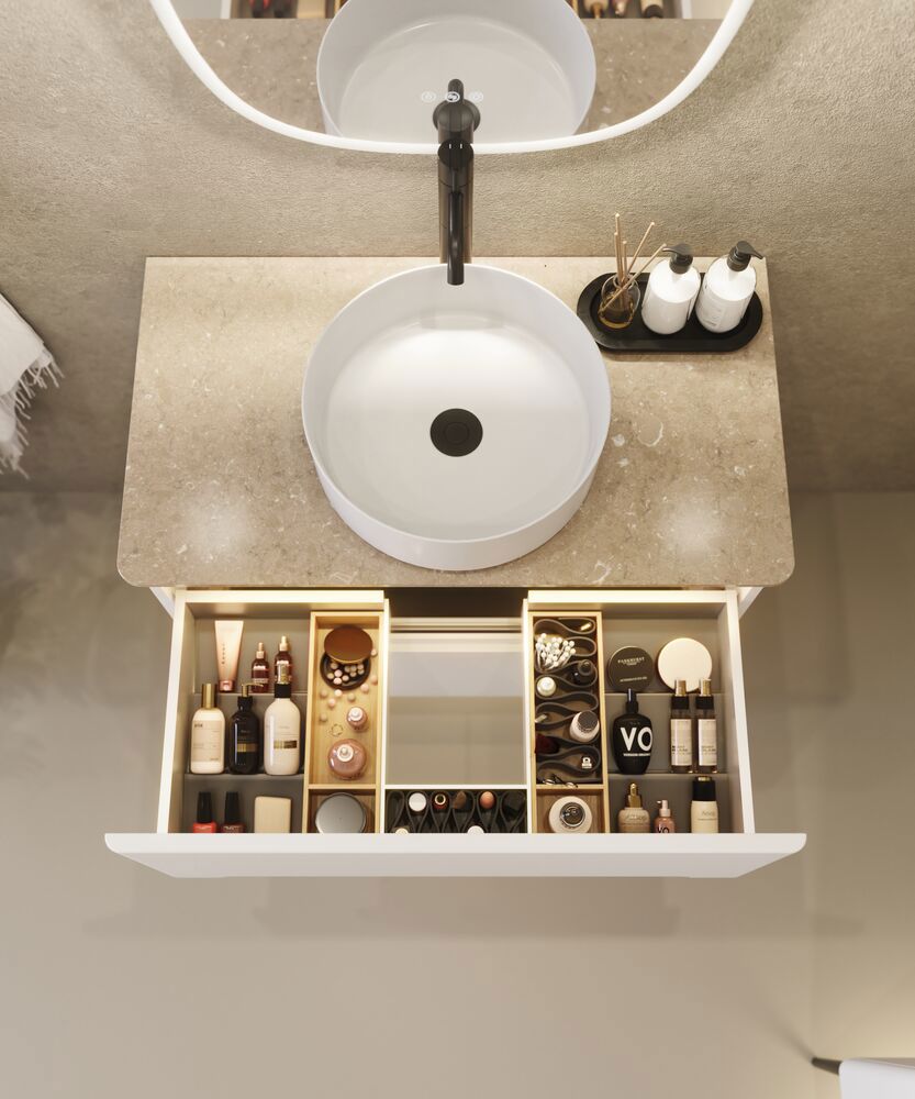 Silestone werkbladen met afgeronde hoeken combineren exclusief design met hoge prestaties - en passen prachtig bij de Vintage serie met geïntegreerde handgrepen, waarbij het meubel ook de zachte, afgeronde vormen heeft. Het resultaat is een harmonieus geheel in de badkamer, waar zowel het meubel als het werkblad dezelfde designtaal spreken. Gemaakt van natuurlijk kwarts via een geavanceerd technologisch proces, is het oppervlak sterk, vlekbestendig en gemakkelijk te onderhouden. Door de harde, gladde afwerking is het werkblad bestand tegen dagelijks gebruik en behoudt het jarenlang zijn luxueuze uitstraling. Silestone is verkrijgbaar in een groot aantal kleuren en patronen - van klassiek, tijdloos wit tot gedurfde tinten - zodat u precies de look kunt creëren die bij uw persoonlijke stijl past. Wat je ook kiest, het werkblad voegt een vleugje elegantie en verfijning toe aan je badkamer. Let op: de kleur van het werkblad kan afwijken van de getoonde afbeelding. We raden je daarom aan om een monster te bekijken bij een verkoper voordat je beslist.