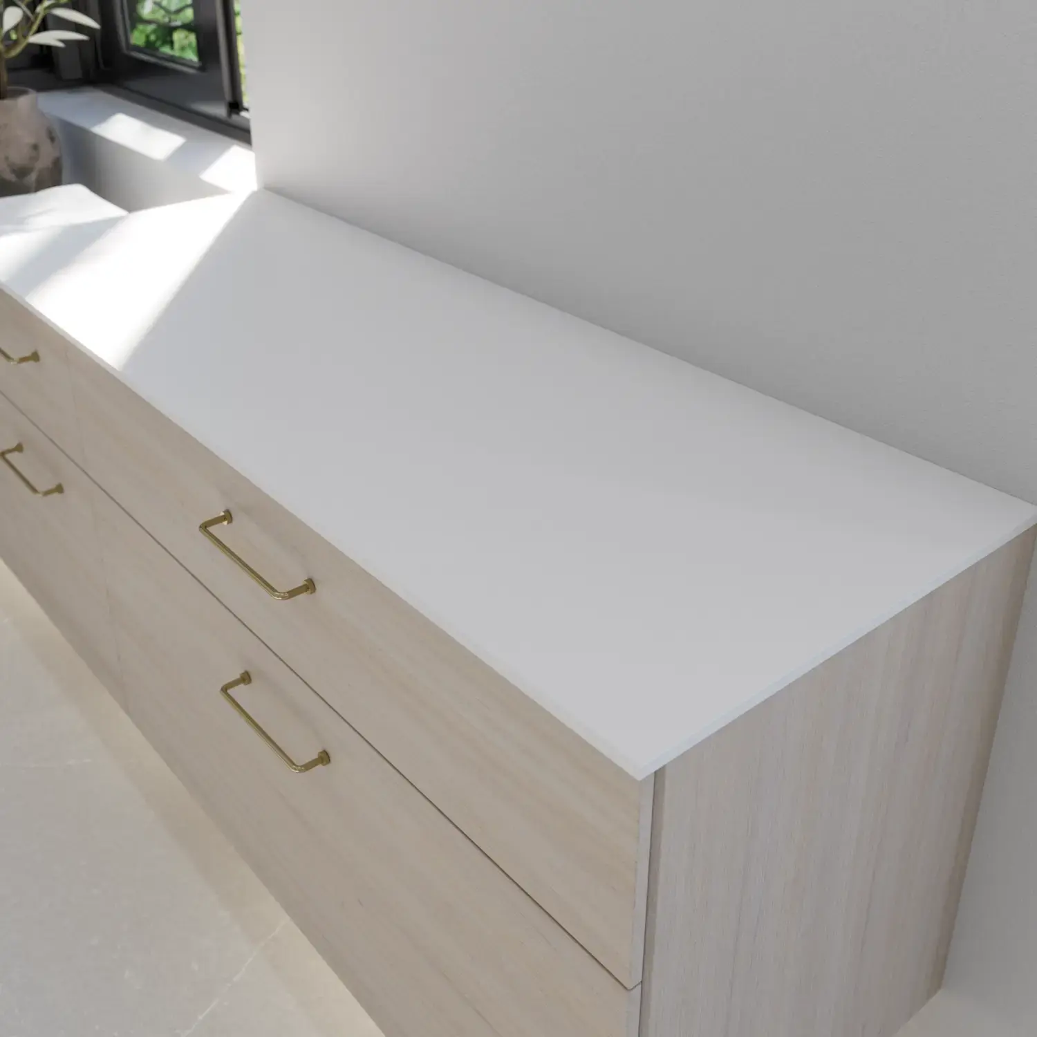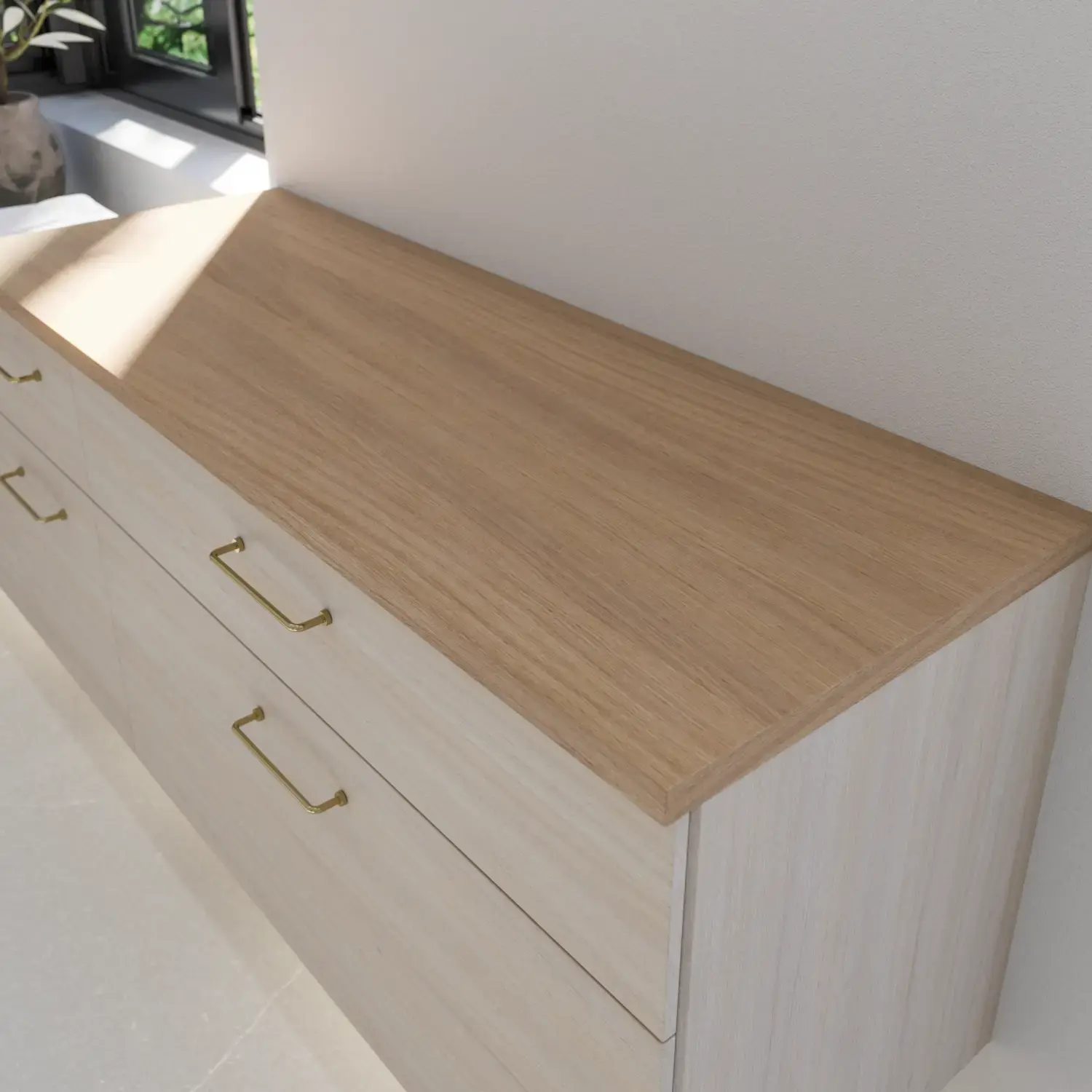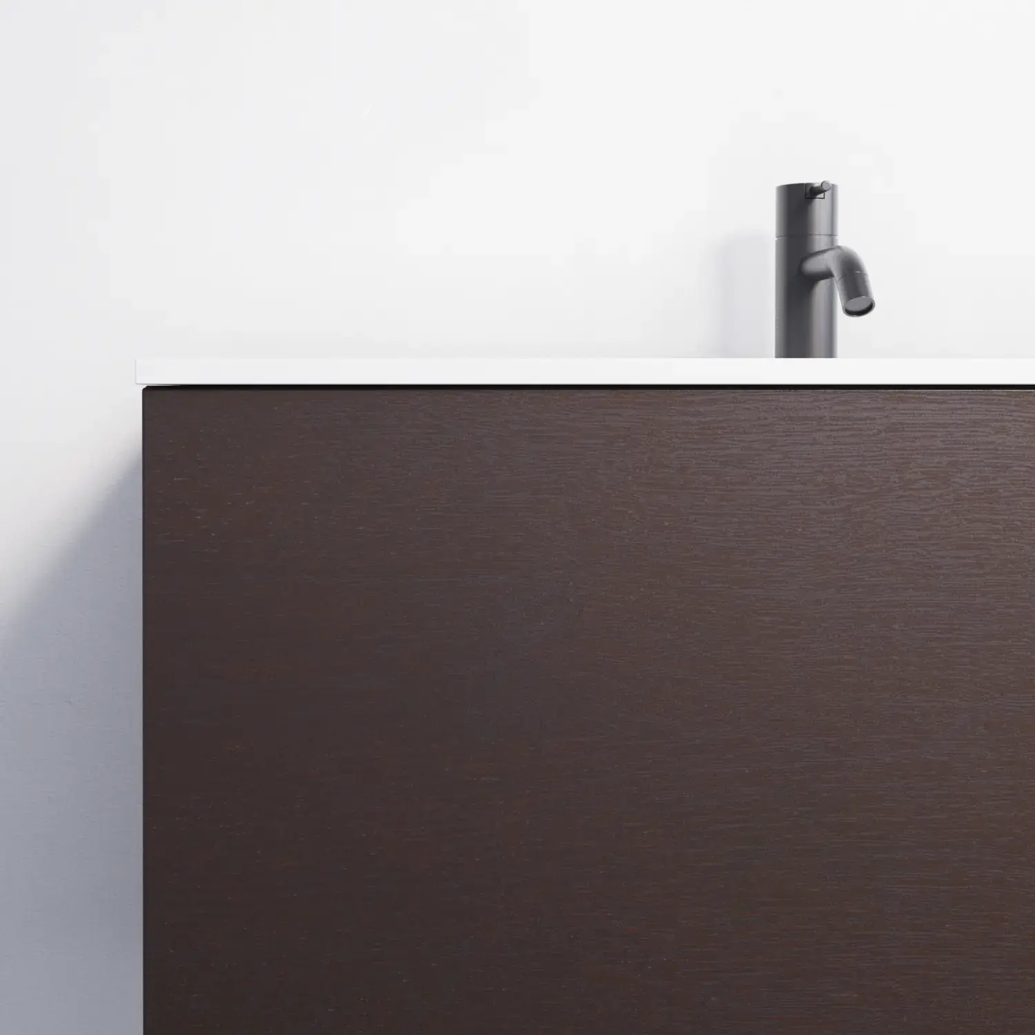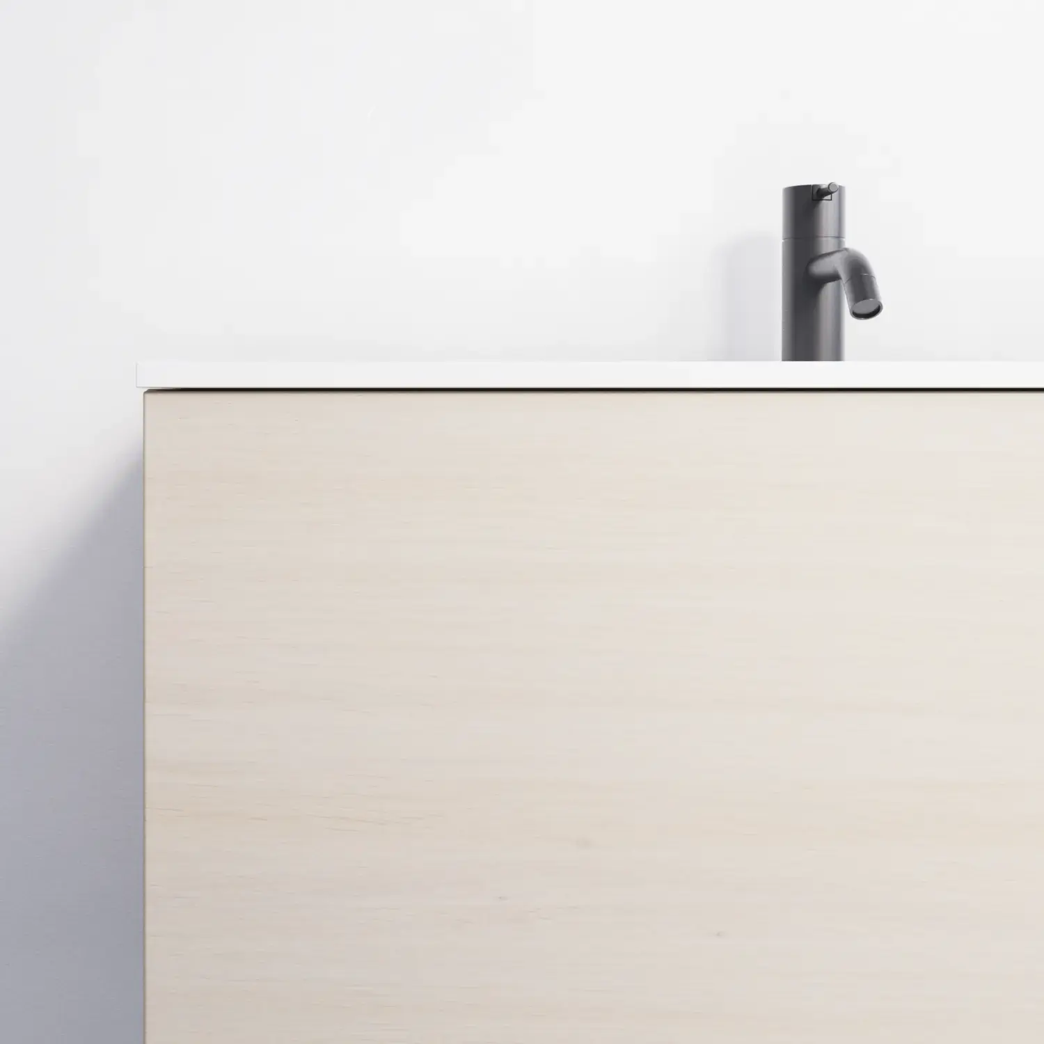 Het is uiteraard ook mogelijk om een mooi monochroom geheel te creëren door te kiezen voor een houten werkblad met dezelfde afwerking als het meubel – dat wil zeggen een van de 7 gefineerde afwerkingen.