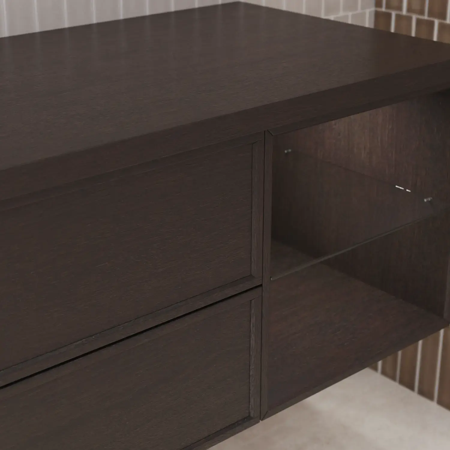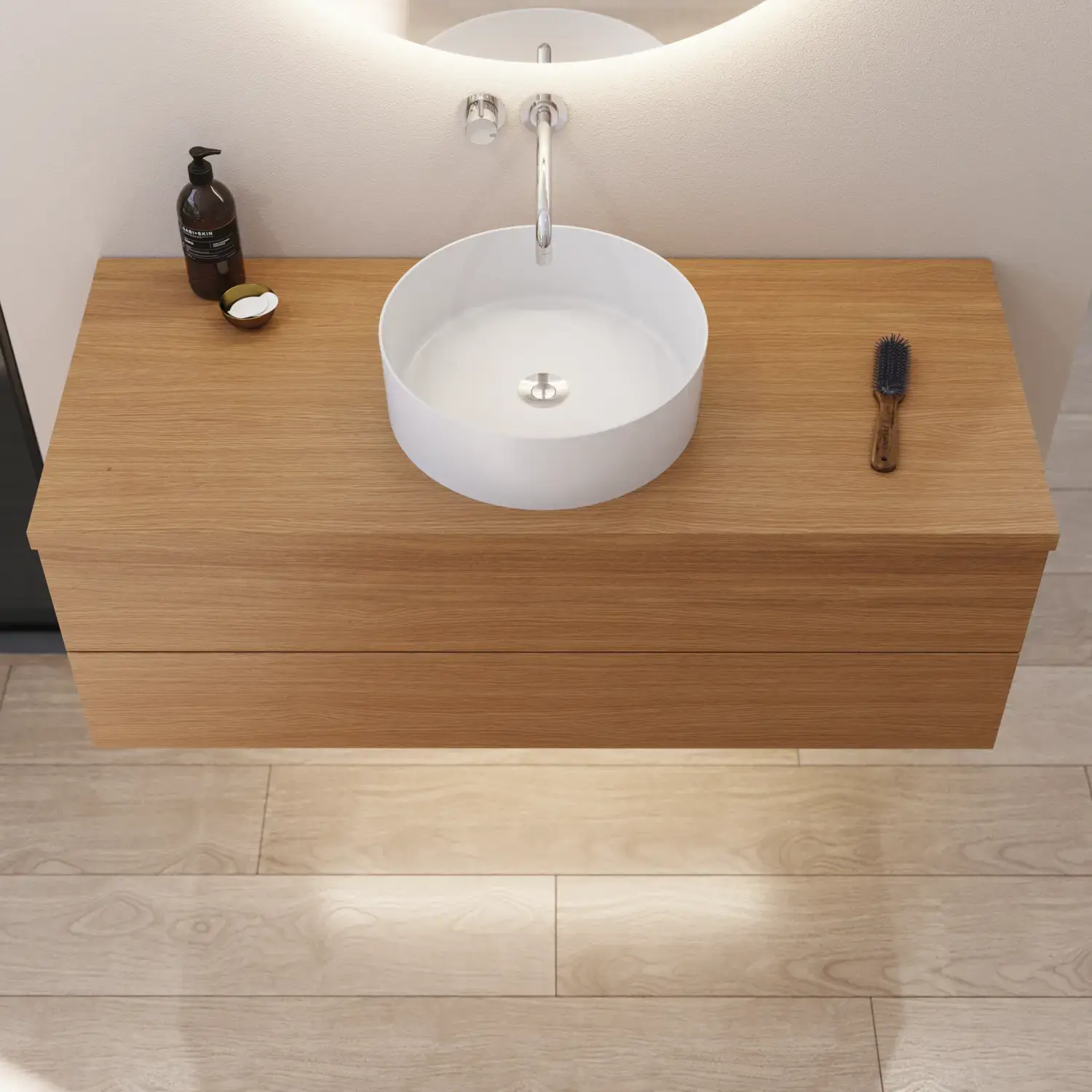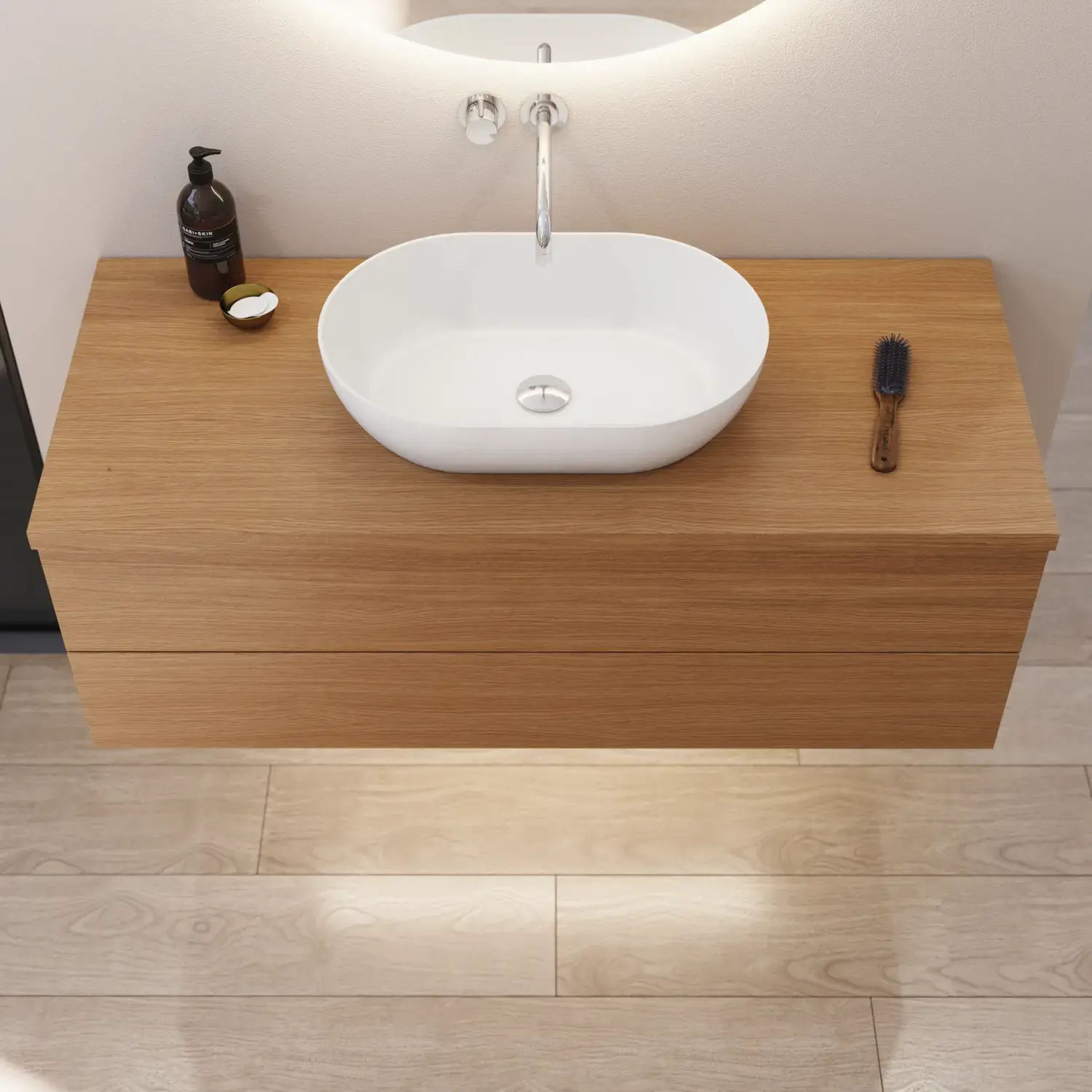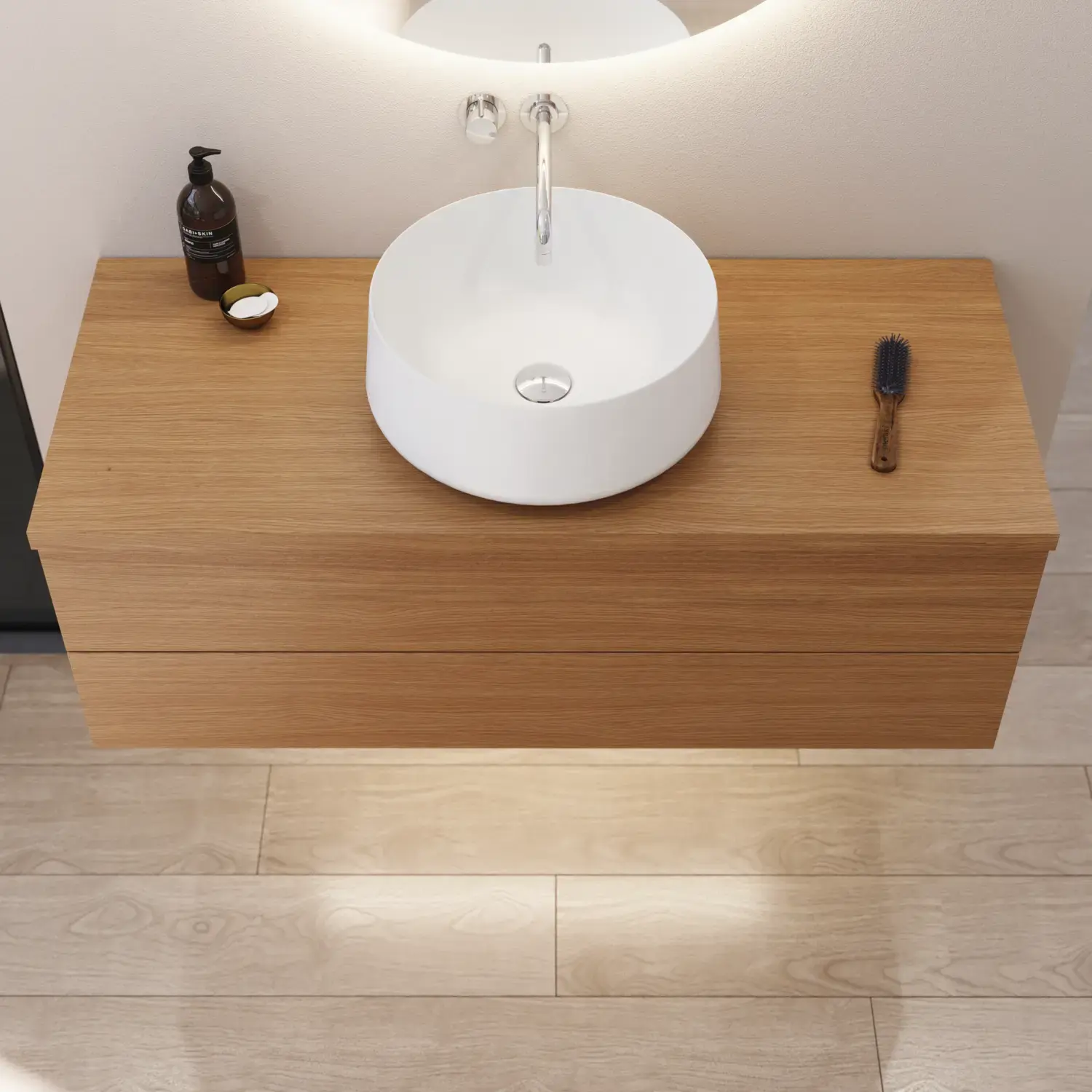 Het is uiteraard ook mogelijk om een mooi monochroom geheel te creëren door te kiezen voor een houten werkblad met dezelfde afwerking als het meubel – dat wil zeggen een van de 7 gefineerde afwerkingen.
