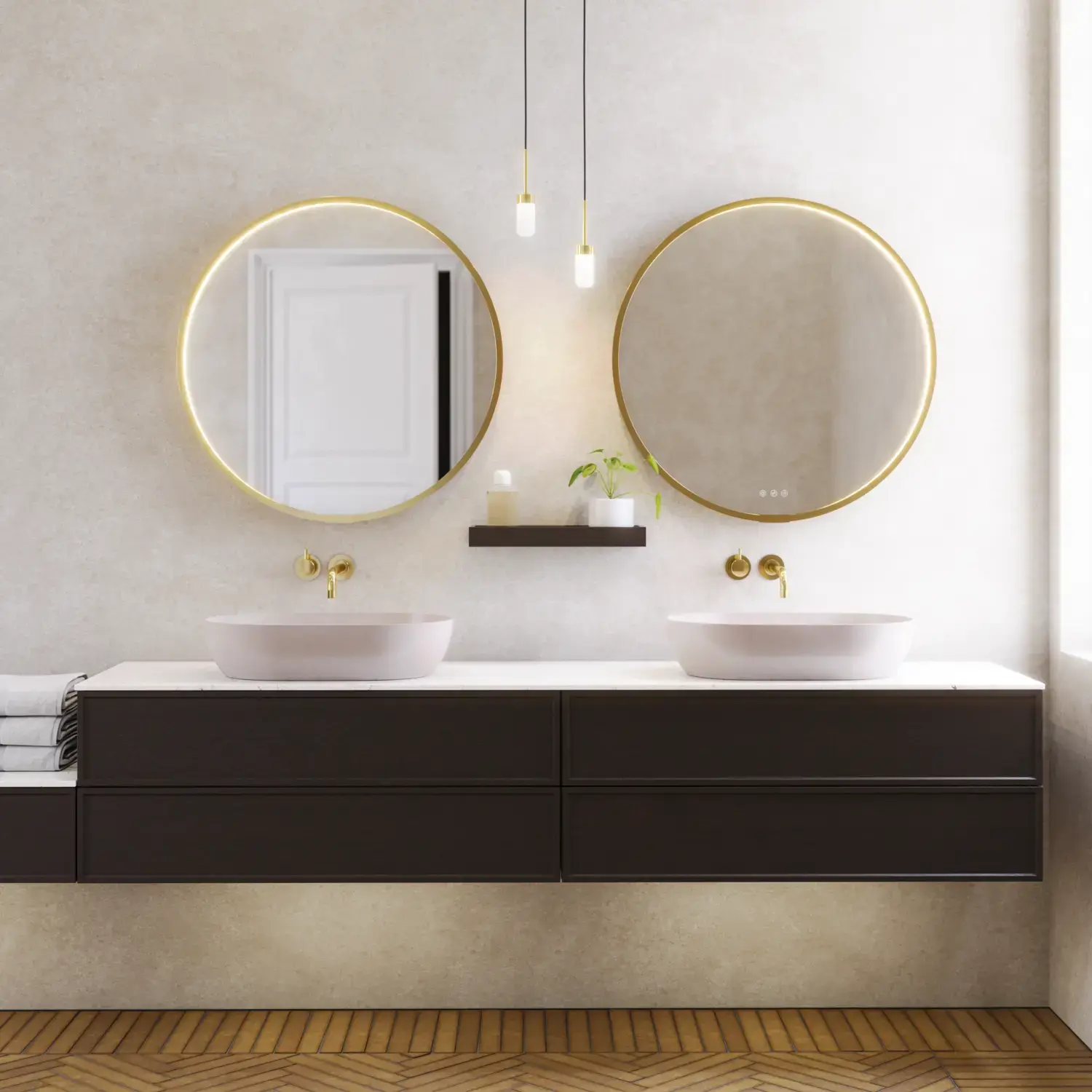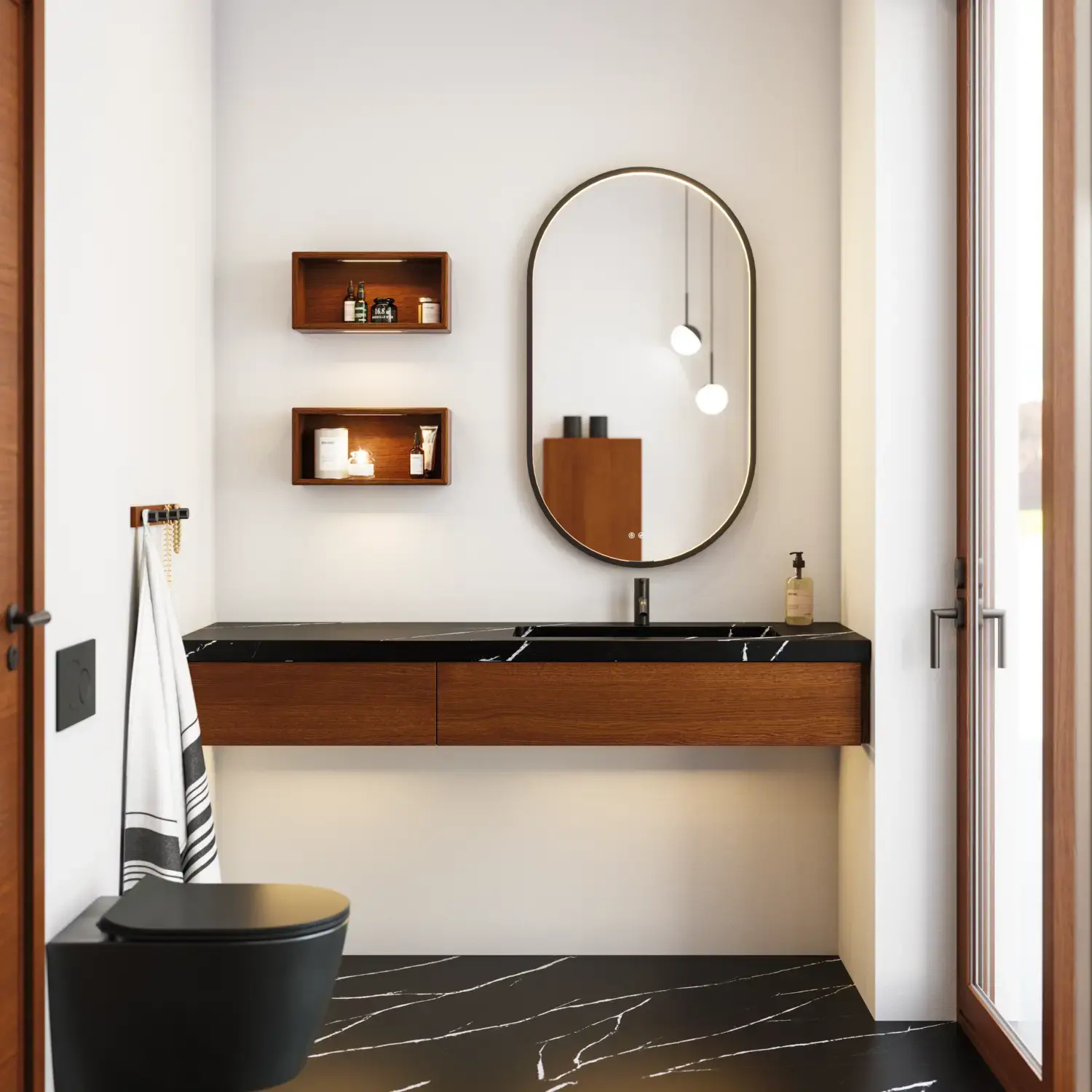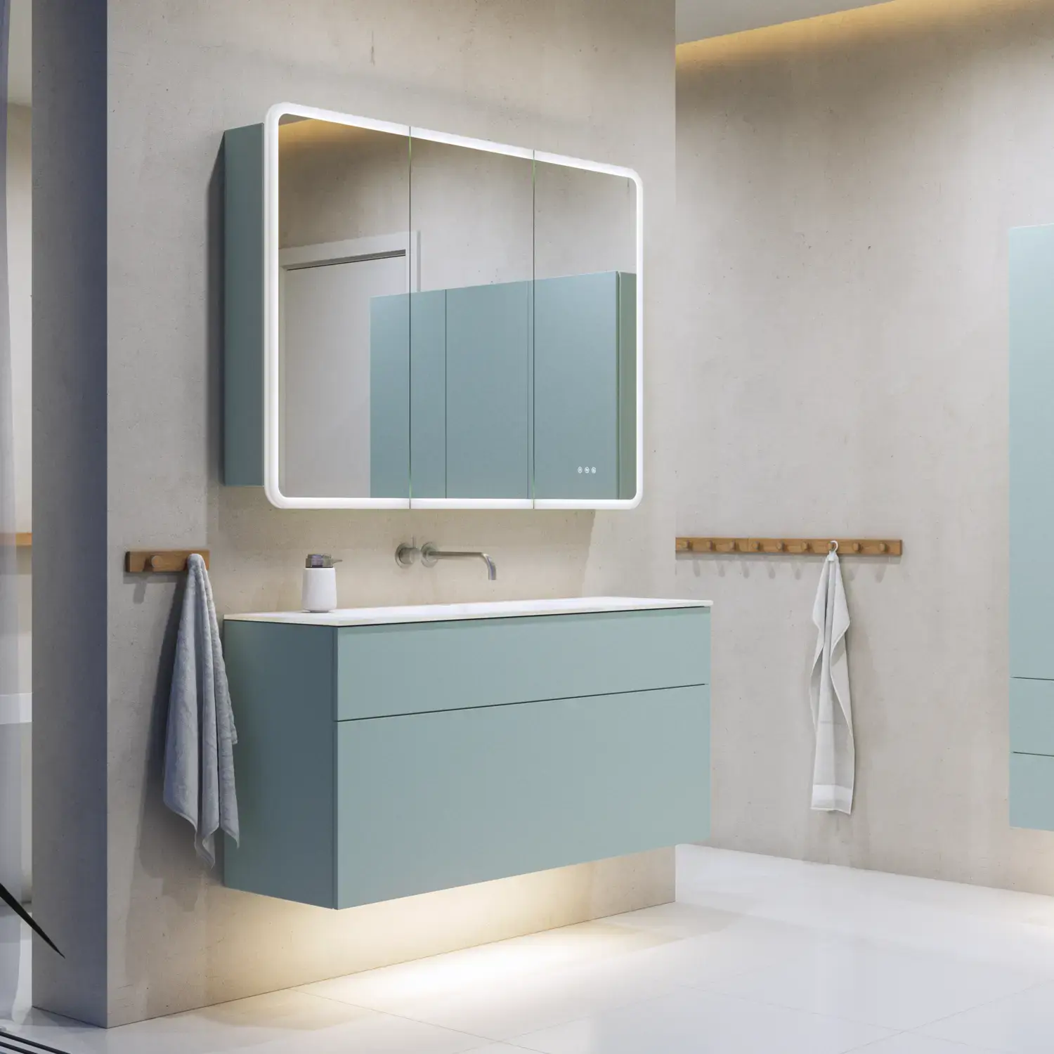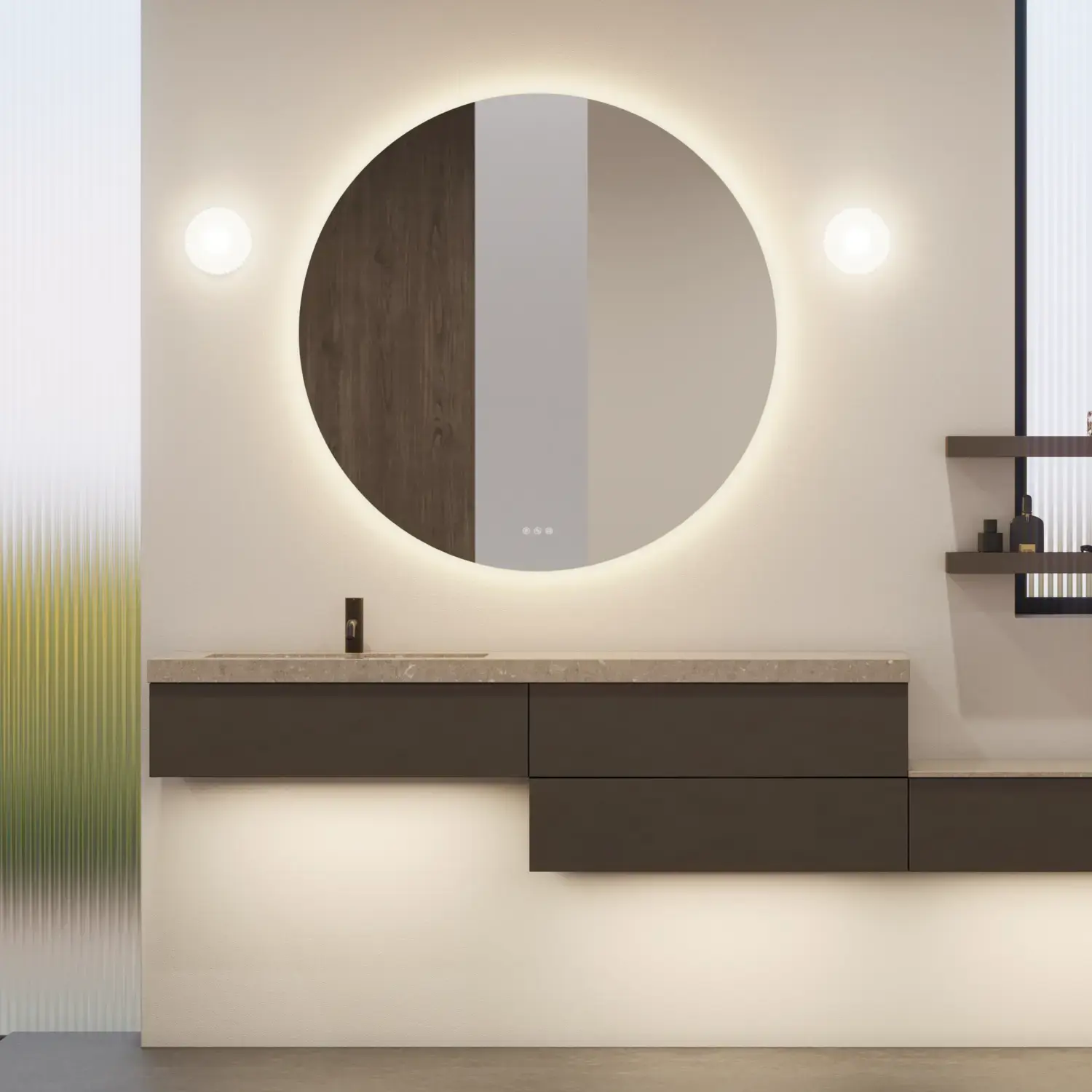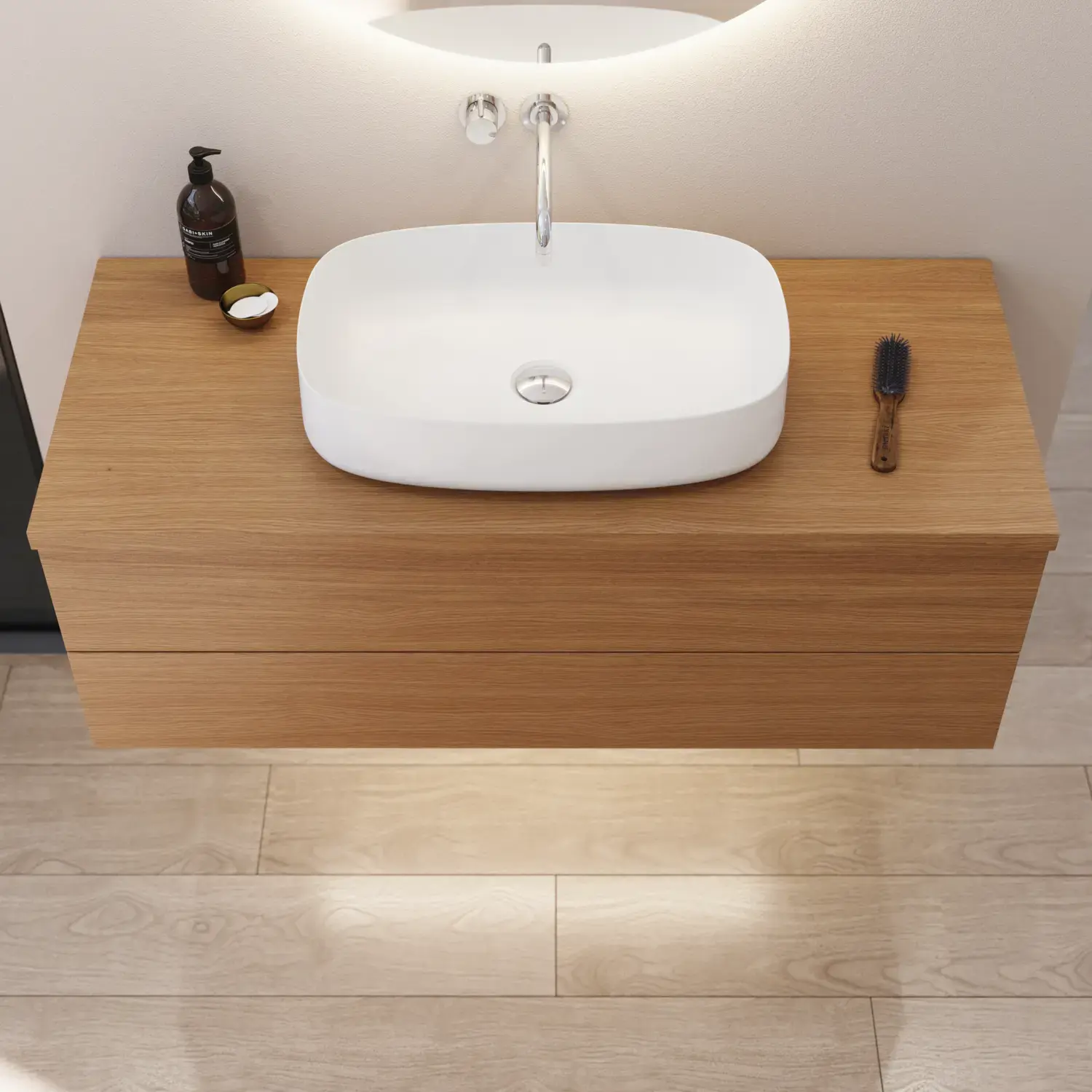 Inkl. spiegelverwarming, draadloos lichtregelsysteem, vergrootspiegel, magneetstrip, metalen planchet, handgrepen, 1x230V contactdoos met schakelaar en USB-aansluiting,