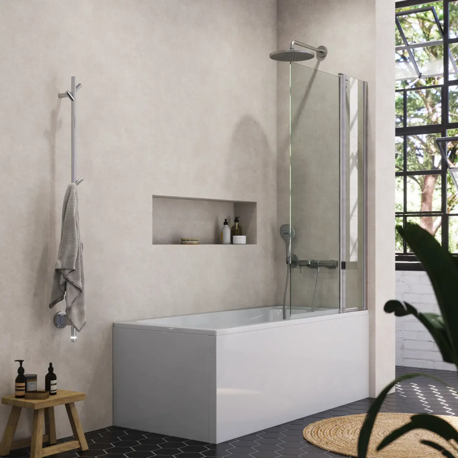 Maak optimaal gebruik van het bad met deze comfortabele badwand. De glazen deur kan in een hoek van 90° voor de kranen gedraaid worden. De scharnieren met hefmechanisme laten de glazen deur fraai openen en sluiten. Stabiliteitssteun wordt meegeleverd.