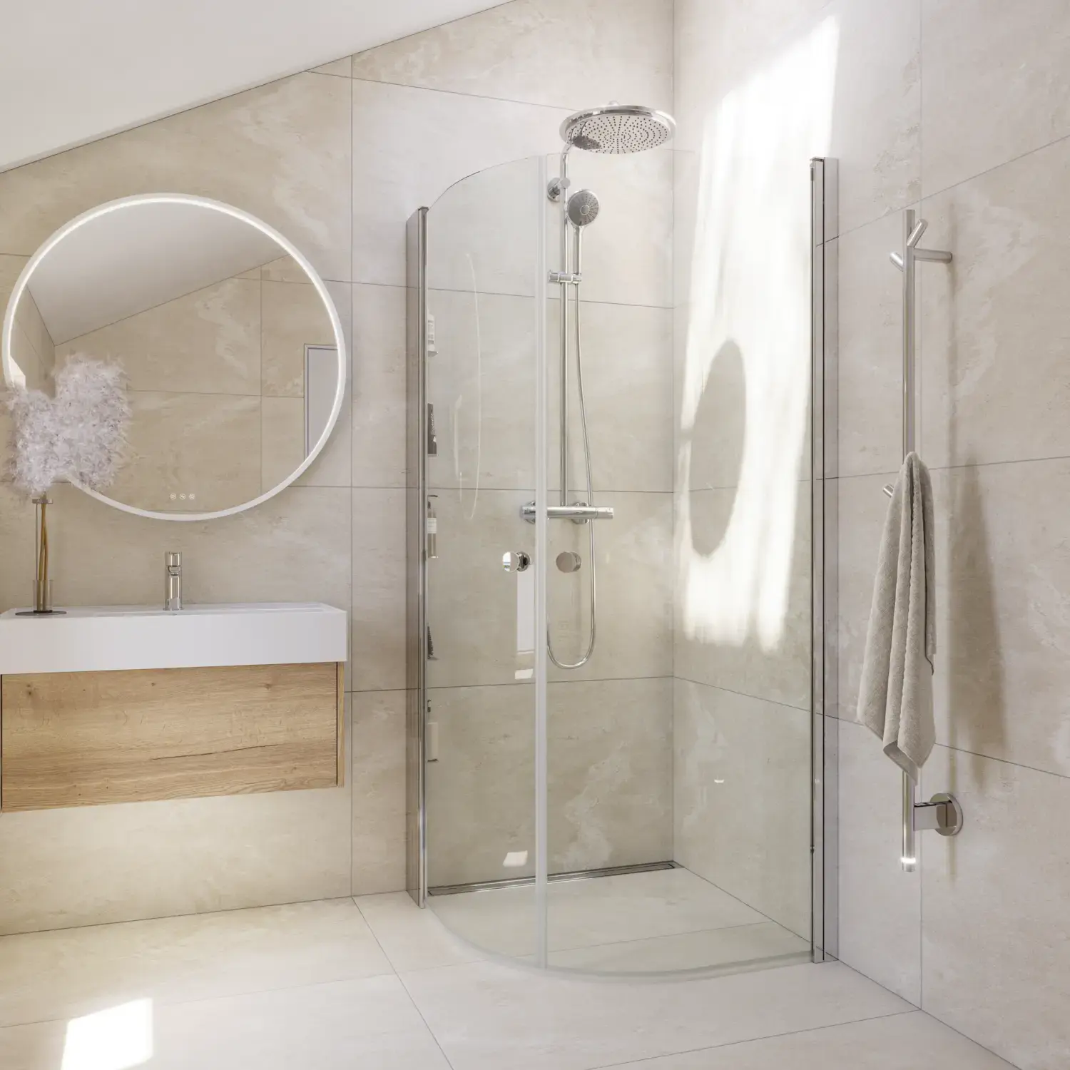 Twee kwartronde deuren van Dansani Match kunnen gecombineerd worden tot een douchehoek. De deuren kunnen zowel naar buiten als binnen gedraaid worden hetgeen ruimte oplevert als de douche niet in gebruik is.