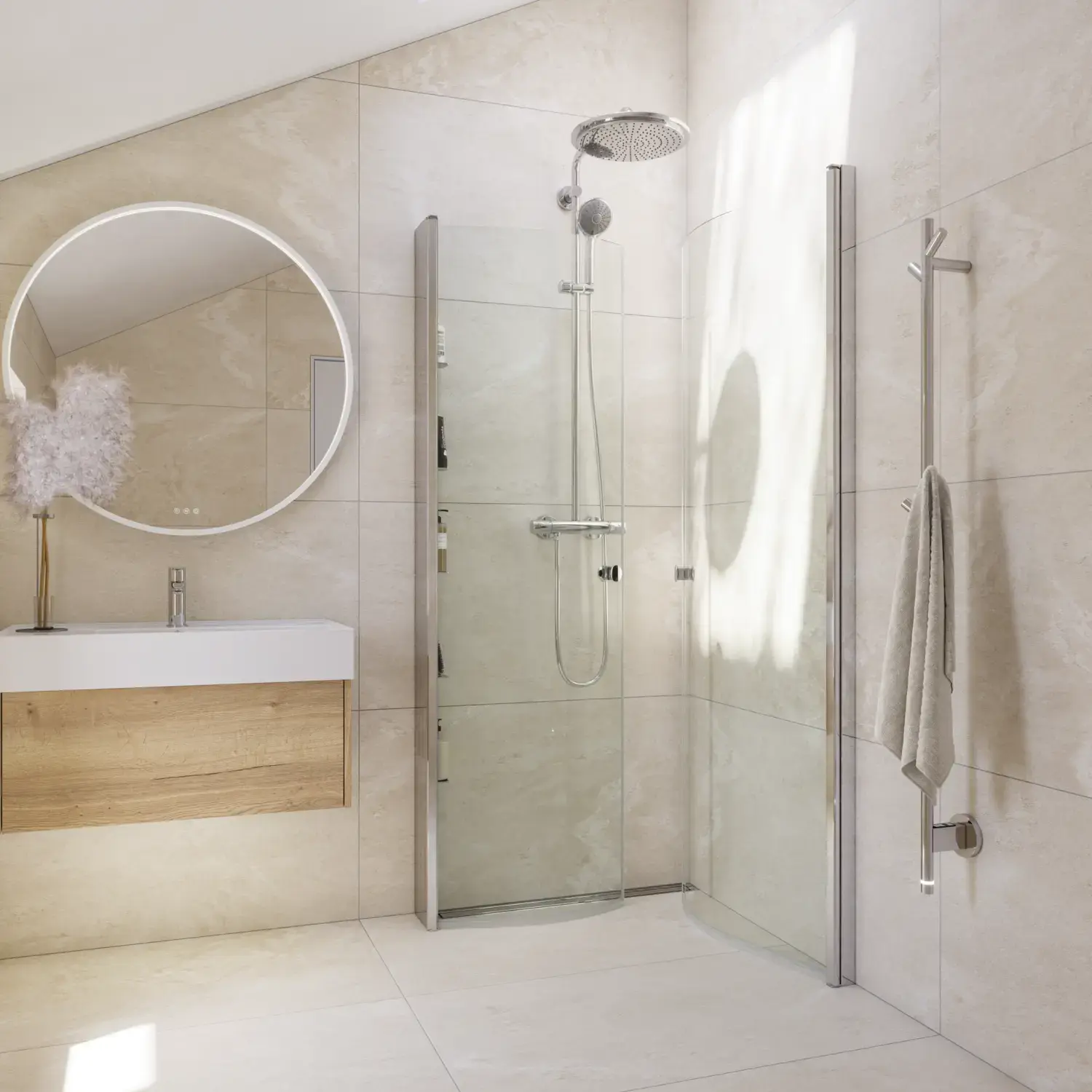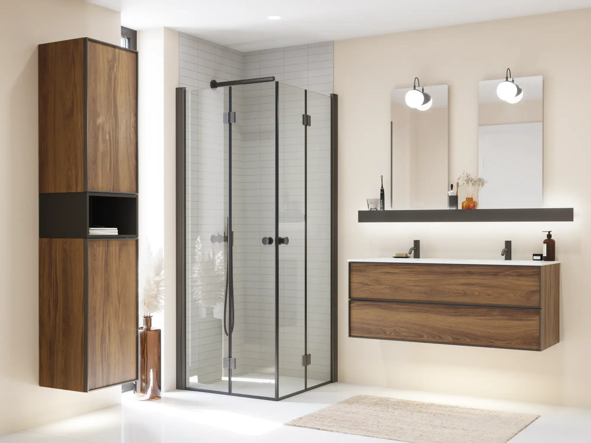 Als u een compacte badkamer heeft kunt u toch de wanden direct naast de douchehoek benutten als u kiest voor draaideuren met vast paneel. De douchedeuren vouwen naar binnen, zodat ze zo weinig mogelijk ruimte innemen.