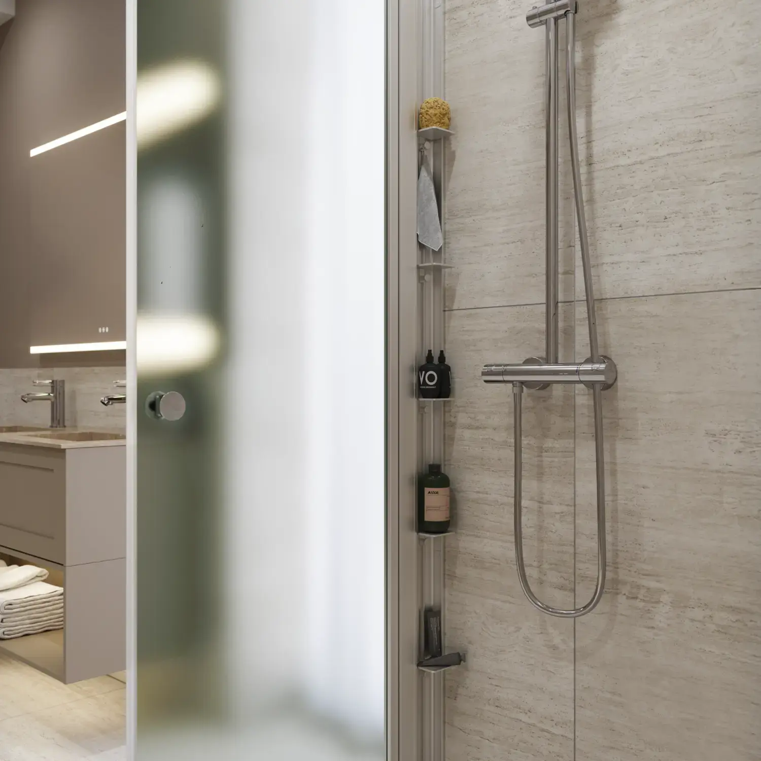 Iedereen heeft een hekel aan een rommel in de badkamer, vooral in de doucheruimte. Met het Tower-hoekregaal dat integraal deel uitmaakt van het Match-assortiment, beschikt u over opbergruimte voor shampoo, zeep en wat u verder nog nodig heeft onder de douche. Tower is verkrijgbaar in zowel zwart als in mat alu.