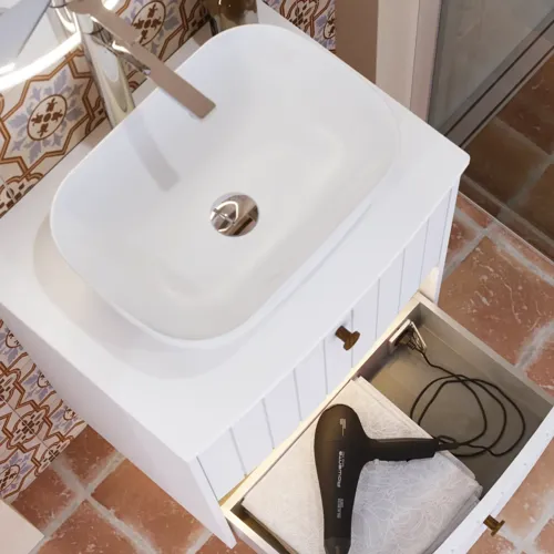 Witte oppervlakken weerkaatsen het licht en hebben een bijna magisch vermogen om de ruimte groter en luchtiger te doen lijken. Een wit werkblad is daarom perfect voor zowel kleine als grote badkamers, waar het rust, balans en openheid brengt. In de Calidris-serie kun je een bijzonder minimalistische uitstraling creëren met een dun, wit solid surface werkblad dat elegant boven het wastafelmeubel zweeft. In de Luna-serie zorgt de combinatie van een wit mat laminaat werkblad en een bijpassende porseleinen wastafel voor een strak maar huiselijk effect. Ongeacht het gekozen materiaal helpt de witte kleur om de details van de ruimte – tegels, kranen of kasten – te accentueren en creëert zo een geheel waarin licht en materialen harmonieus samenwerken. Dankzij maatwerkopties wordt het werkblad perfect aangepast aan jouw ruimte en ondersteunt het een architectonisch strakke lijnvoering. Dit is het witte effect op zijn best: functioneel en poëtisch tegelijk.