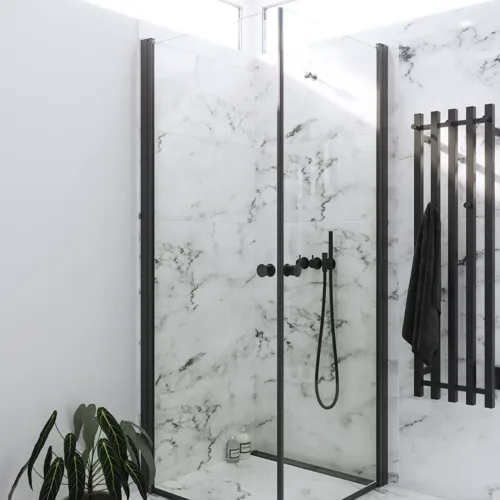 Je krijgt dus zowel stijl als functionaliteit in één oplossing – en als je een samenhangende look in de badkamer wilt creëren, passen de zwarte handdoekverwarmingen perfect bij onze Match-douchewanden met zwarte accenten. Dat zorgt voor een rode draad in het interieur, zonder dat het zwaar of overheersend wordt.