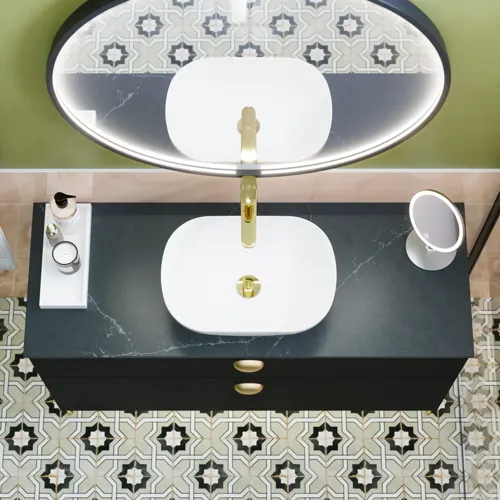 Een zwart werkblad komt het best tot zijn recht wanneer het wordt gecombineerd met andere elementen die de algehele stijl ondersteunen. Combineer bijvoorbeeld met zwarte kranen voor een samenhangende en moderne look. Je kunt ook een van onze stijlvolle spiegels met zwarte rand kiezen, die perfect passen bij de uitstraling: Kies bijvoorbeeld voor Moon, een elegante spiegel met verlichting en een zwarte aluminium lijst, of de ronde Hoop-spiegel, verkrijgbaar met zwarte rand en geïntegreerde verlichting. Samen met een zwart werkblad creëren deze elementen een gecoördineerde, tijdloze en harmonieuze badkamer. Je kunt ook spelen met contrasten door een witte opzetwaskom op het zwarte blad te plaatsen – dit accentueert de vorm van de waskom en creëert een spannend samenspel tussen licht en donker. Door materialen, kleuren en details zorgvuldig te combineren, creëer je een persoonlijk en doordacht badkamerontwerp.