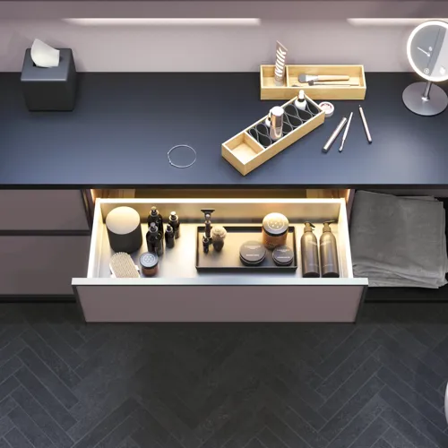 Hoewel zwarte oppervlakken traditioneel geassocieerd worden met grotere ruimtes, kan een zwart werkblad ook prima in een kleine badkamer worden gebruikt – het draait om balans en styling. Kies bijvoorbeeld voor zwart eiken laminaat uit de Luna-serie of een Silestone®-variant met lichte structuur en matte afwerking, dan creëer je een rustige en verfijnde look zonder dat de ruimte benauwd aanvoelt. Combineer eventueel met lichte muren, een witte wastafel en verlichte spiegels voor visueel contrast en ruimtelijkheid. Het voordeel van het Dansani-assortiment is dat je werkbladen op maat kunt krijgen, zodat ze precies in de ruimte passen. Je kunt het zwarte werkblad ook zonder afvoeruitsparing gebruiken als afsluiting van een zijkast – een stijlvolle oplossing die geen extra ruimte inneemt. Zwarte werkbladen werken dus ook perfect – zelfs in compacte badkamers.